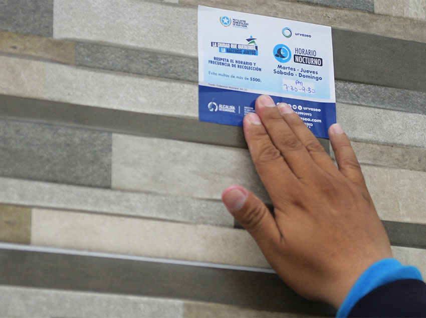 La Dirección de Aseo Cantonal, Mercados y Servicios Especiales (DACMSE), en coordinación con Urvaseo, lidera este despliegue en territorio con jornadas de socialización puerta a puerta, atención permanente de reportes ciudadanos a través de la línea 181 y la notificación a predios que incumplen la normativa vigente.