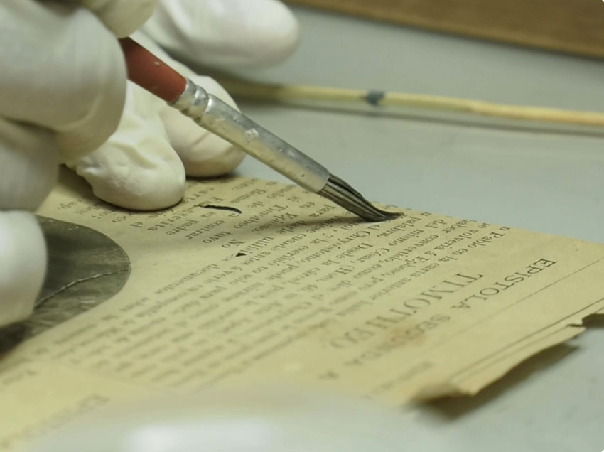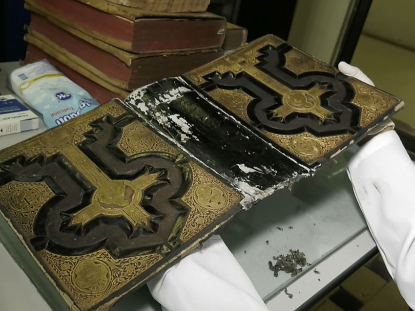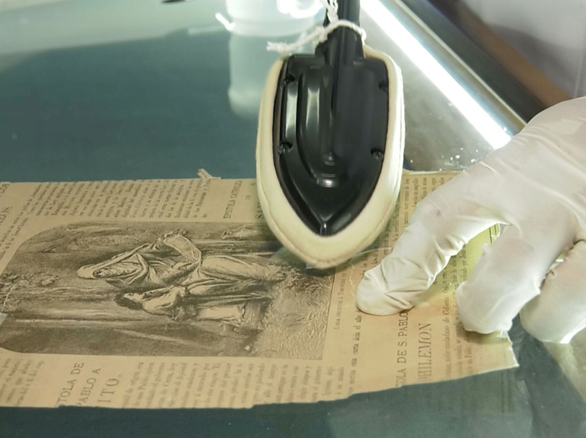 “Esta biblia data de 1.865 (…), cuando la trajeron estaba en mal estado de conservación con algunas páginas rotas, fragmentadas en pedazos, como un rompecabezas (…) en este caso toca buscar cada pedazo, donde calza, donde tiene continuidad el texto y de ahí se va uniendo utilizado un papel antiácido”, dijo Ordoñez.